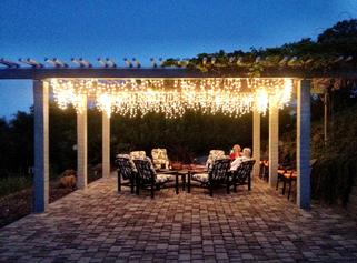 The Cabana Patio, lit on a summer evening.